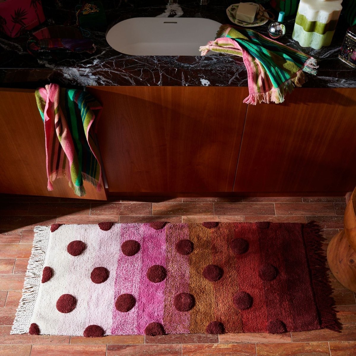 Bring warmth, colour and personality to your bathroom with the Paige Bath Runner by Sage and Clare. Designed in an extra-long shape, it sits beautifully beside the bath or in front of a double vanity, offering soft comfort underfoot where you need it most. The playful spots and stripes design blends rich tones with textured tufted details for a statement look that feels as good as it looks.