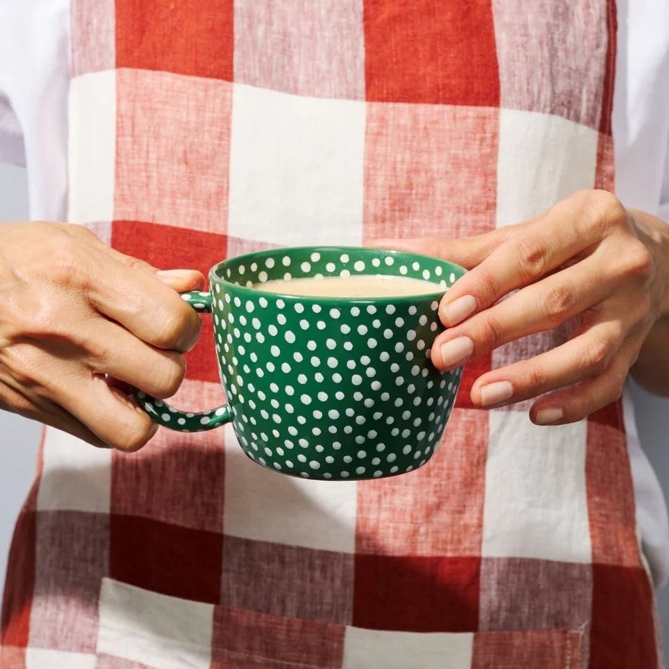 Bring a touch of fun to your daily brew with the Chino Mug Green Sprinkle. Covered in hundreds of hand-painted white sprinkles, each spot tells a story of skilled craftsmanship from the Jones & Co. Vietnamese workshop, inspired by designs born in Sydney. The matching green handle and interior completes this earthenware piece that brings joy to everyday moments.