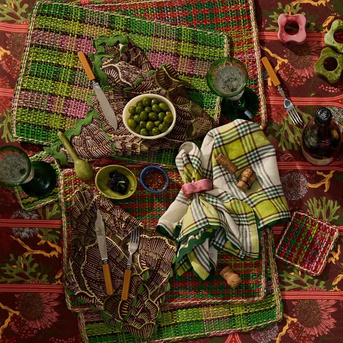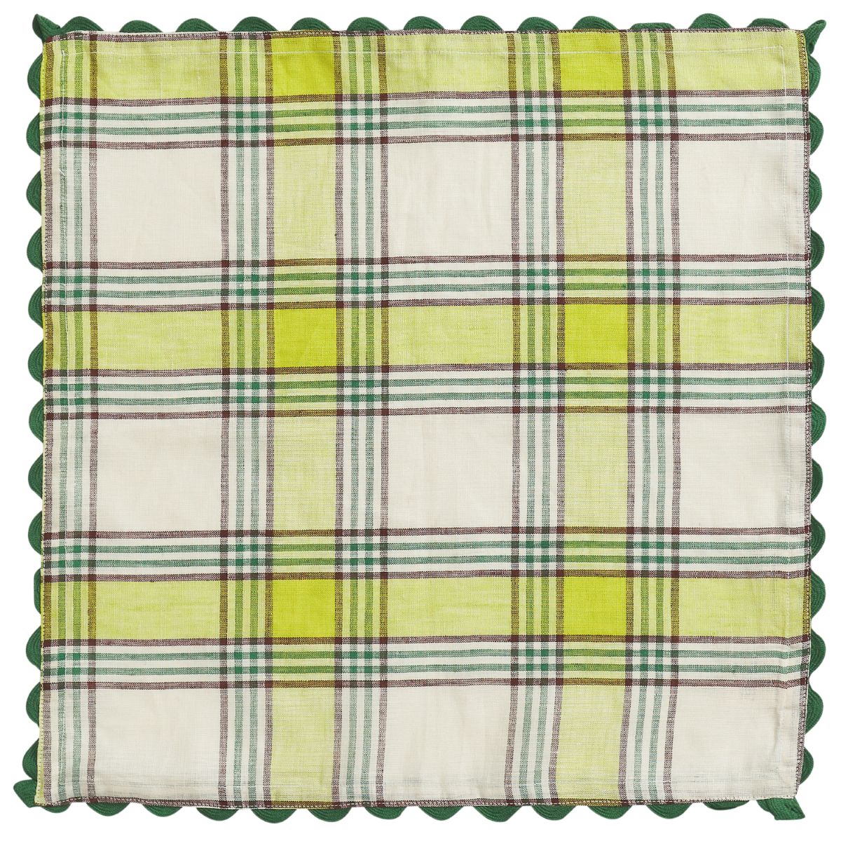 Turn every meal into an occasion with the Claudette Linen Napkin Set by Sage x Clare. Crafted from luxurious European Flax linen, these napkins blend everyday practicality with signature Sage x Clare artistry. Each set features two distinct yet coordinating styles. One with a lime green, bottle green, and dark brown check trimmed in dark green rick rack, and the other with a shell-inspired pattern edged in light green scalloped embroidery.