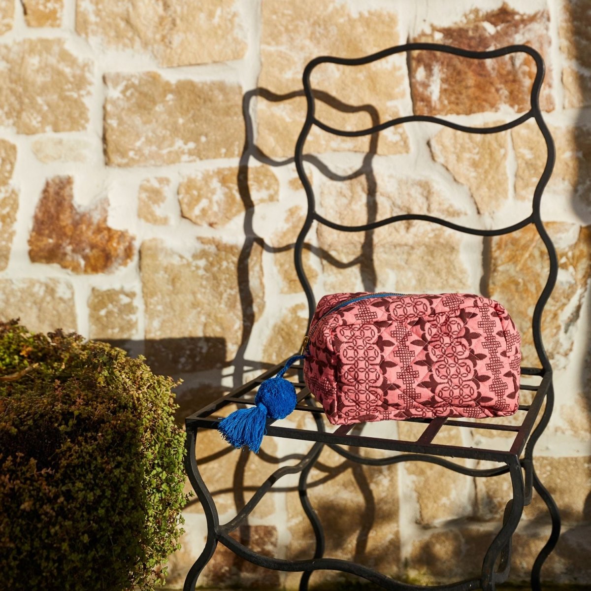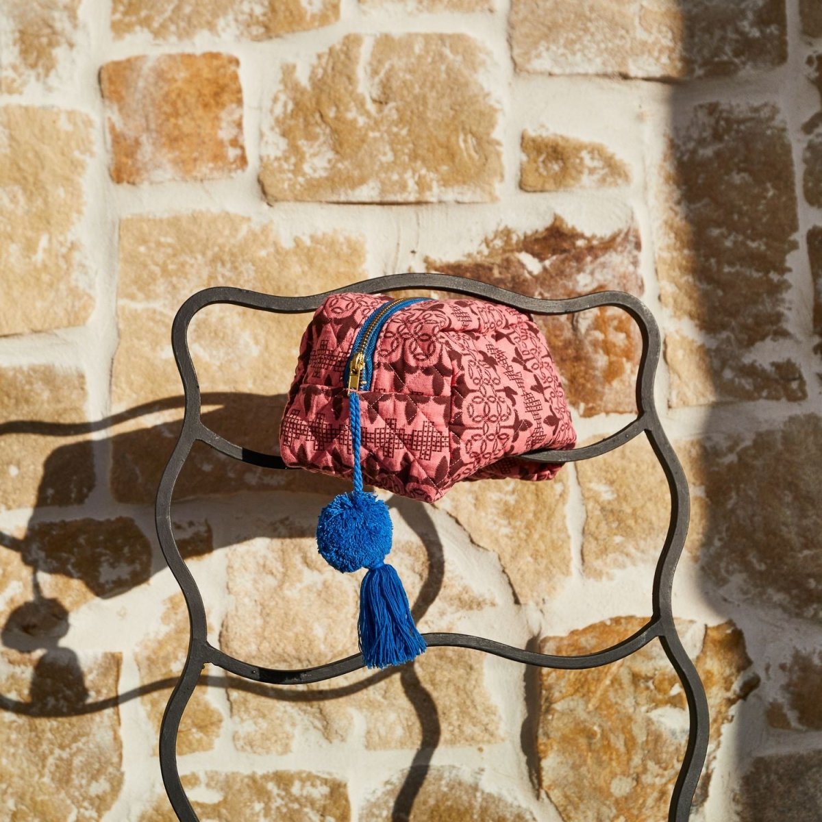 The Esme Beauty Bag from Sage x Clare showcases a quilted geometric pattern in soft dusky pink and rich burgundy, ideal for neatly storing your cosmetics. Its bright blue zipper is highlighted by a charming pom pom and tassel, bringing a fun and unique flair. Compact but roomy, this bag helps keep your daily beauty essentials organized with ease and style.