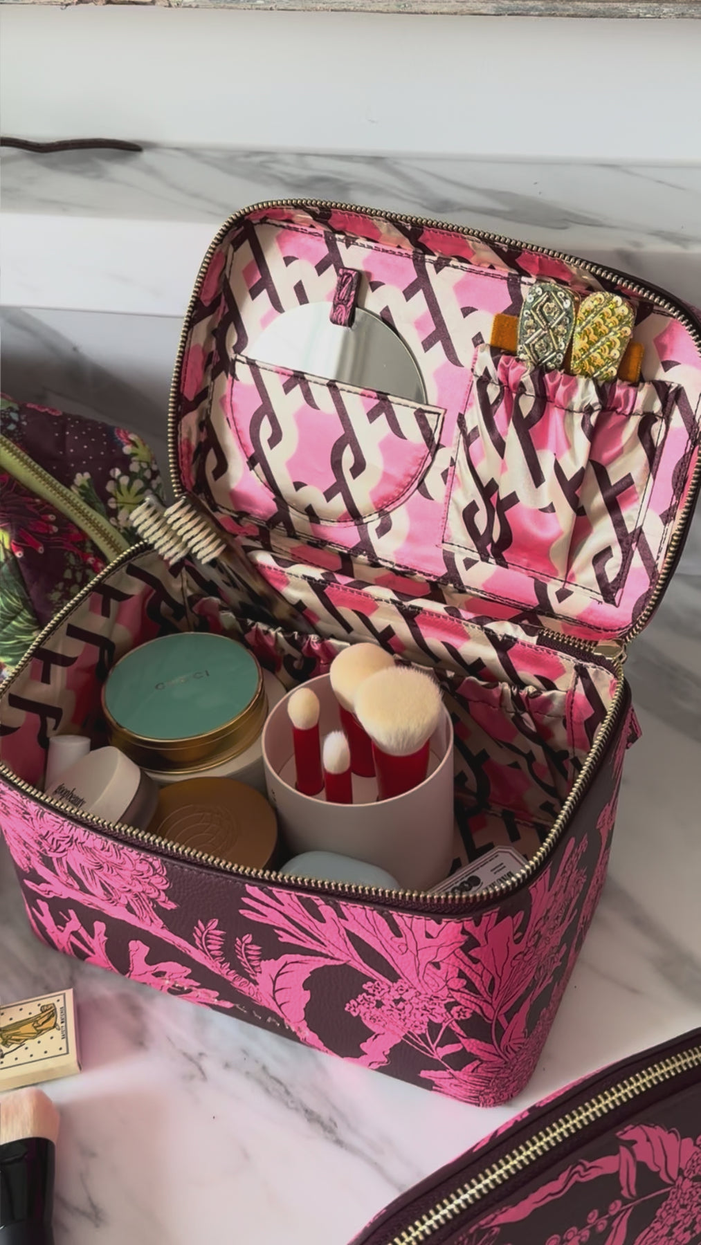 The Delphine Large Vanity Case in Garnet by Sage x Clare provides an ample and stylish way to store your beauty essentials. Designed with a roomy interior, it easily holds all your daily necessities while ensuring they remain organized and protected. Meticulously crafted, this sophisticated case blends functionality with elegance, making it an ideal accessory for everyday use or travel.