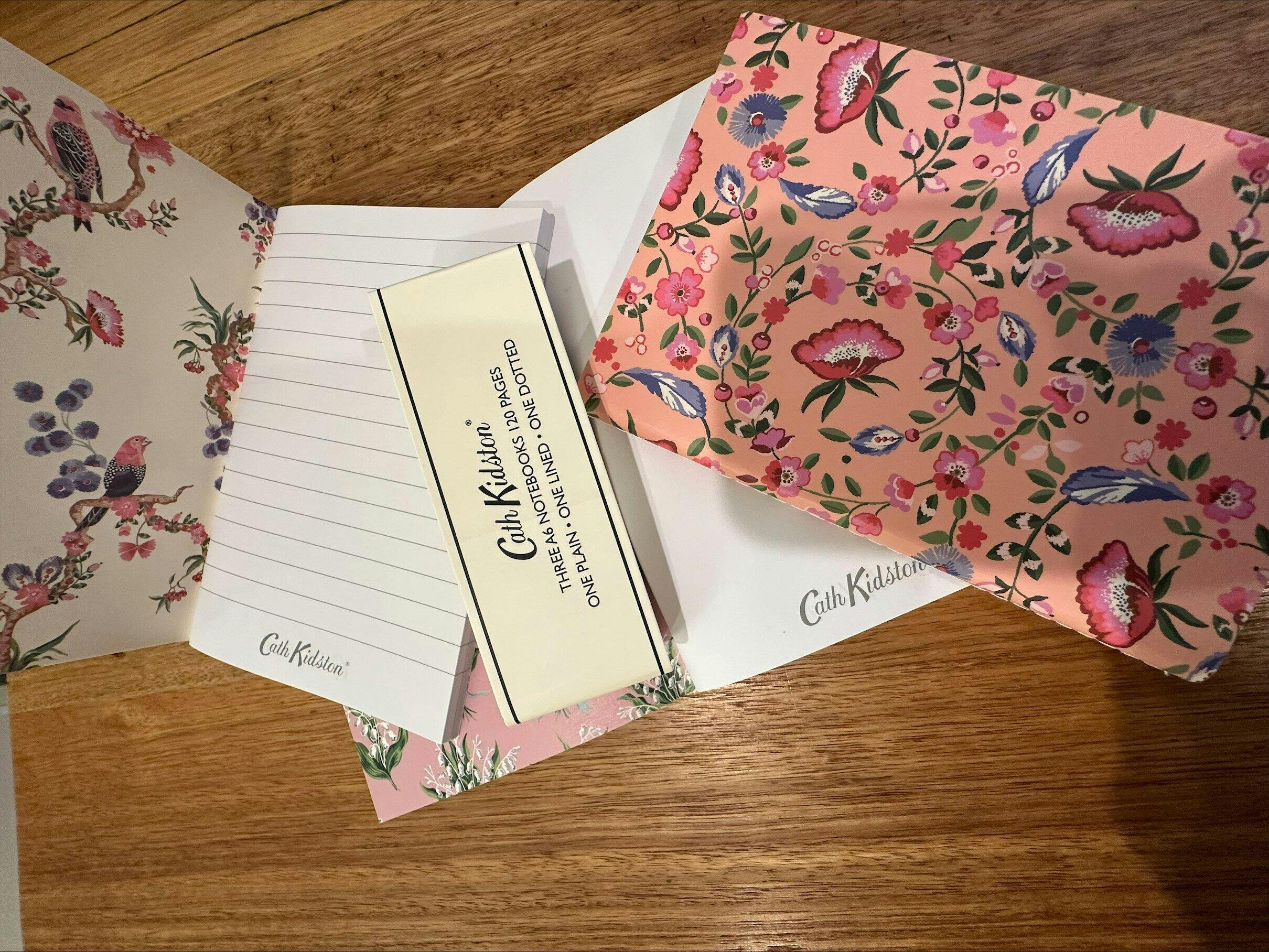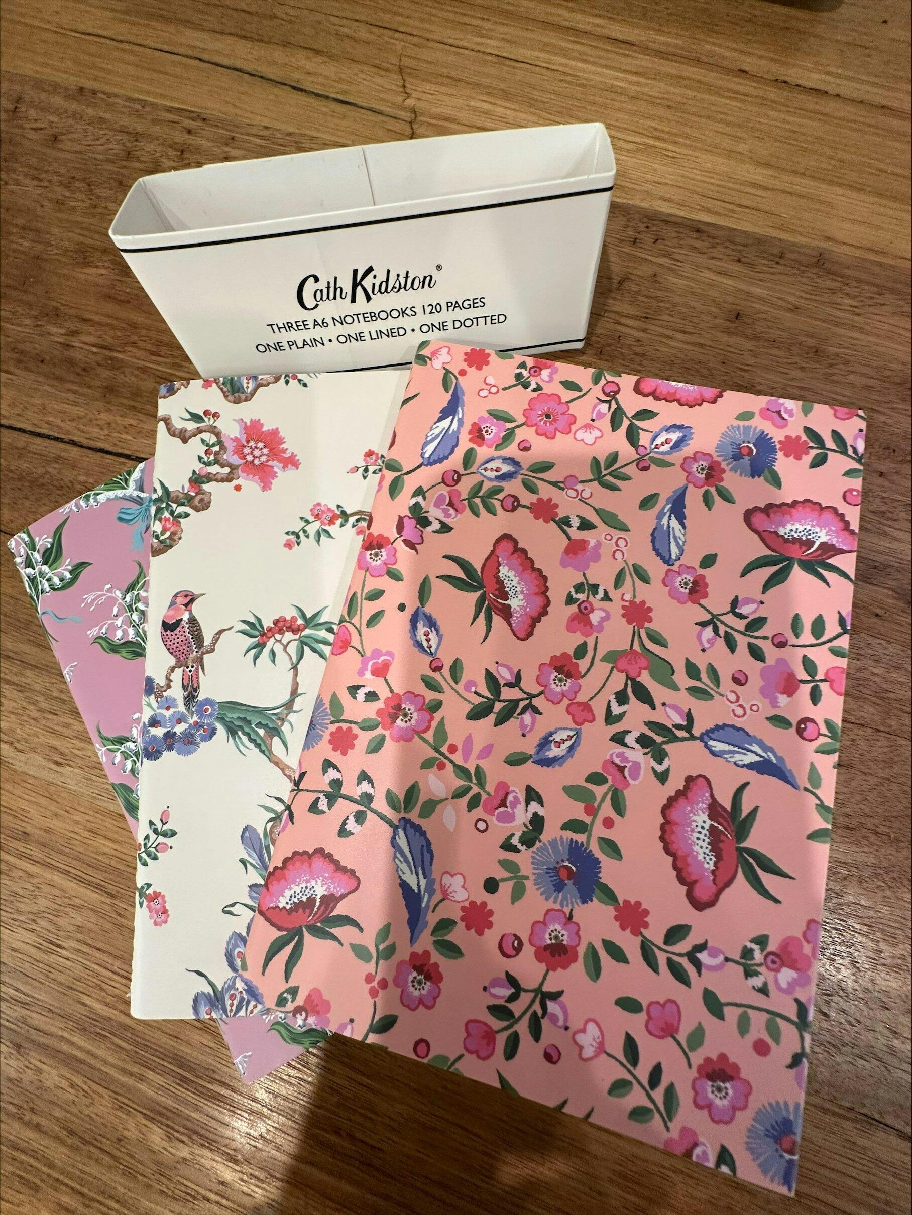 I recently bought the Cath Kidston Floral Notebook Set - no 2, and they are perfect in every way, different cover designs to set no 3. They come in plain, lined & dotted pages so I get to journal, draw, write notes ( with a pen or pencil the old fashioned way ;) ), or take them to seminars, retreats & events when I want to leave my devices switched off. They measure at 10 x 15 cm so small enough to fit in a hand bag or even your back pocket. The colours and patterns Cath uses are eye-catching and fashionable enough to sit on a coffee or bed-side table. I was recently at a seminar and was asked by quite a few people where I bought them. Tempted to buy set no 3. ;) :)